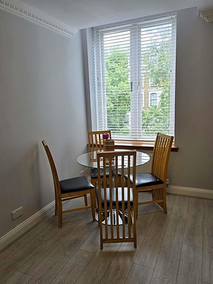 This apartment features simple, modern décor with wooden furniture and tiled floors.